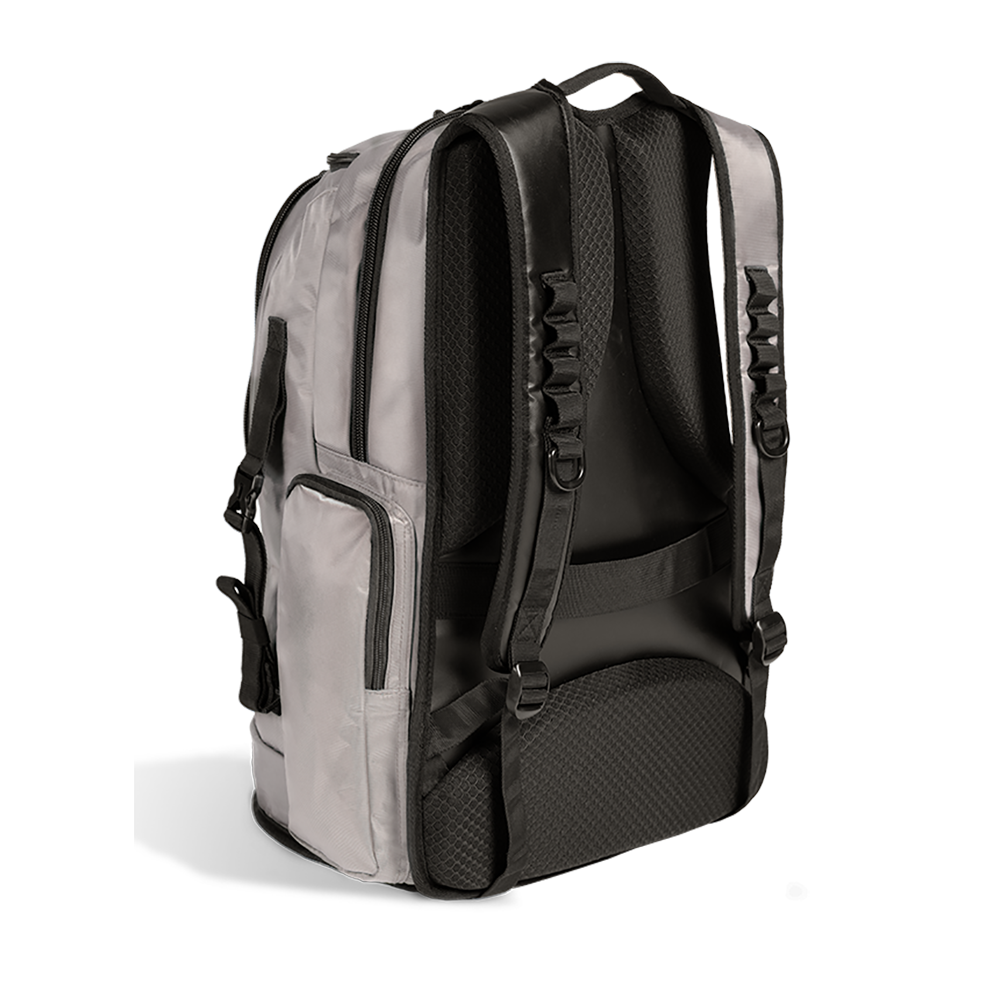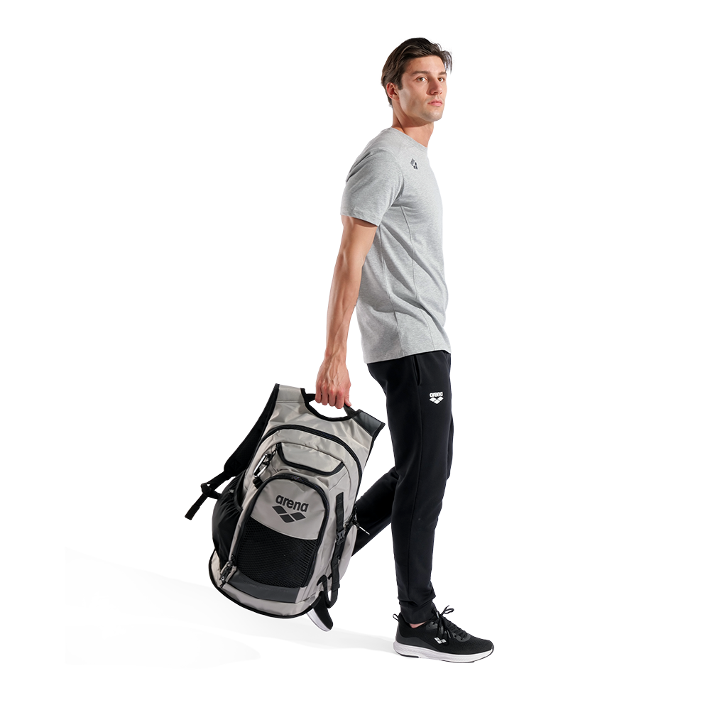 Arena All Set Backpack 45 – Ice is a top loading backpack which is specifically designed for athletes and competitive swimmers.  It provides space for all accessories.  Designed with clever space management, this versatile backpack makes it easy to carry everything you need for training, travel, or daily use. With its sleek design and durable construction, it balances style, function, and comfort.  The 45-litre capacity is divided into two roomy main compartments, perfect for storing clothes, shoes, and also of course your swim gear. Two zipped external pockets keep smaller items like goggles, keys, or accessories within easy reach. A padded laptop sleeve ensures safe transport of your device, while a side mesh pocket also holds your water bottle securely.