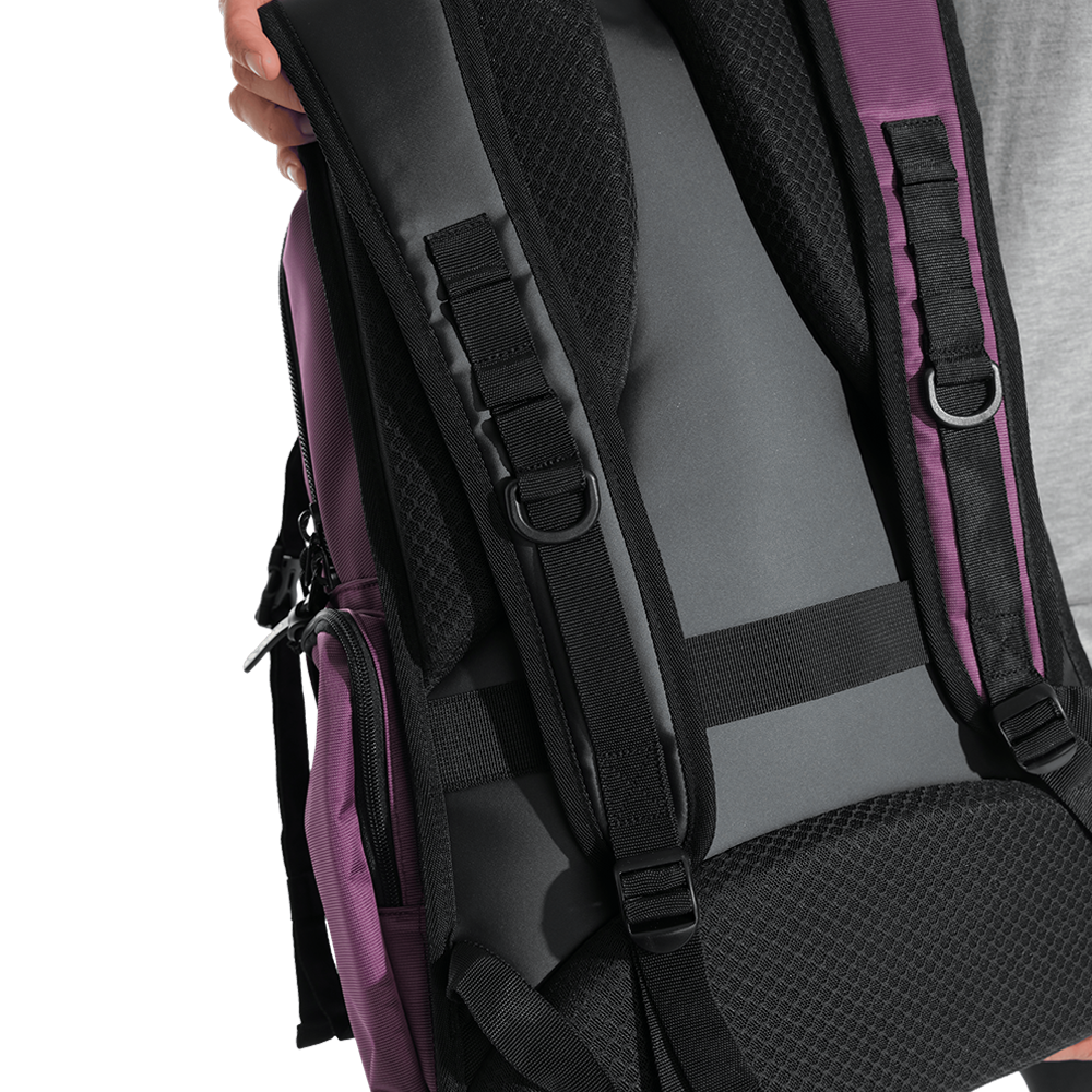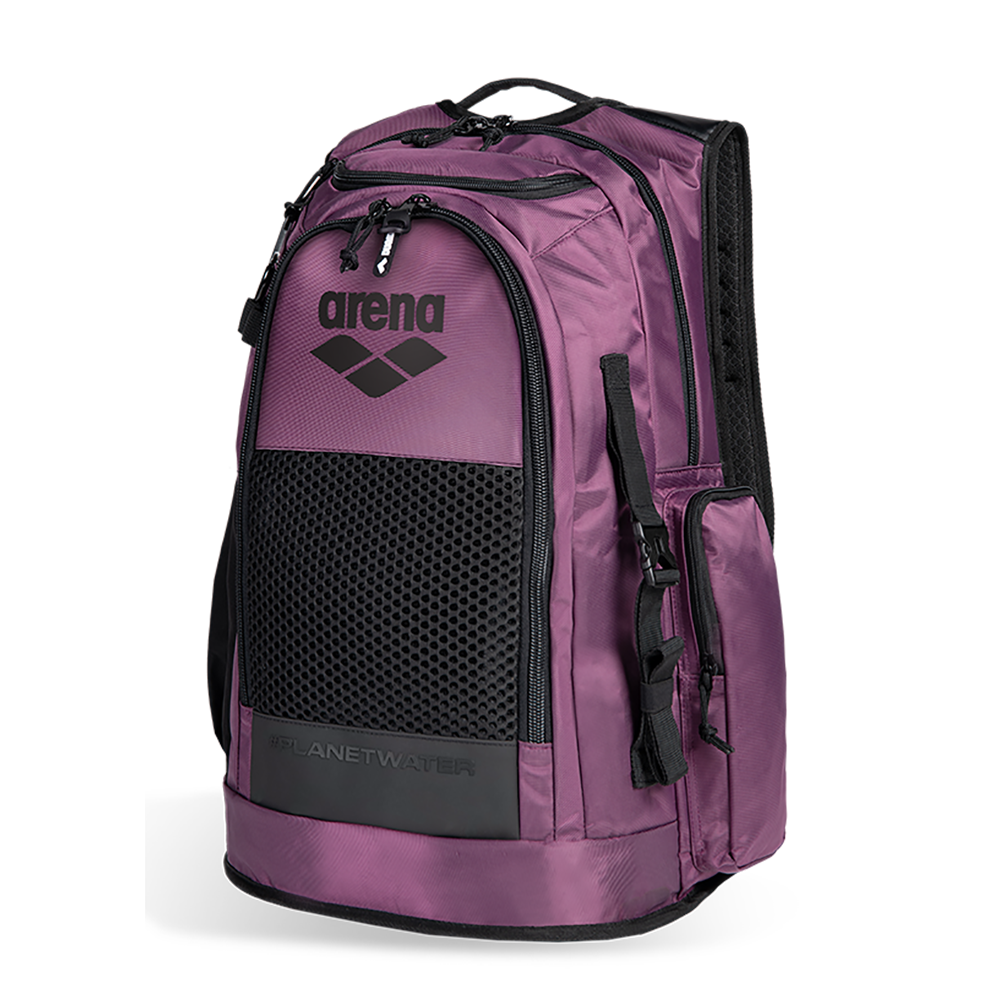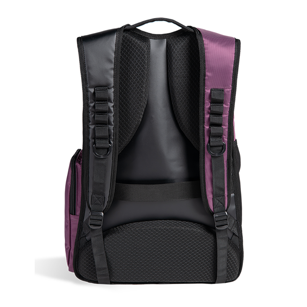 Arena All Set Backpack 45 – Plum is a top loading backpack which is specifically designed for athletes and competitive swimmers. It provides space for all accessories. Designed with clever space management, this versatile backpack makes it easy to carry everything you need for training, travel, or daily use. With its sleek design and durable construction, it balances style, function, and comfort. The 45-litre capacity is divided into two roomy main compartments, perfect for storing clothes, shoes, and also of course your swim gear. Two zipped external pockets keep smaller items like goggles, keys, or accessories within easy reach. A padded laptop sleeve ensures safe transport of your device, while a side mesh pocket also holds your water bottle securely.