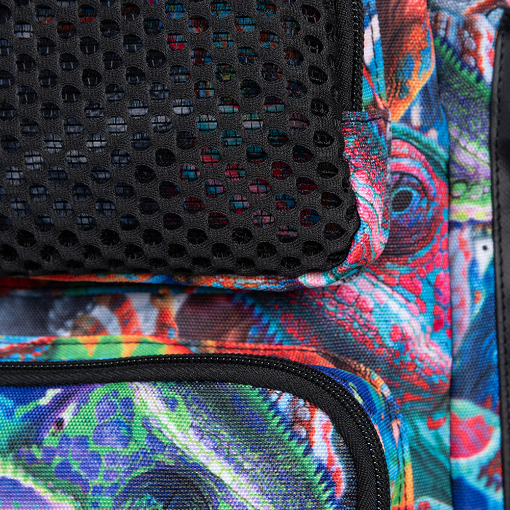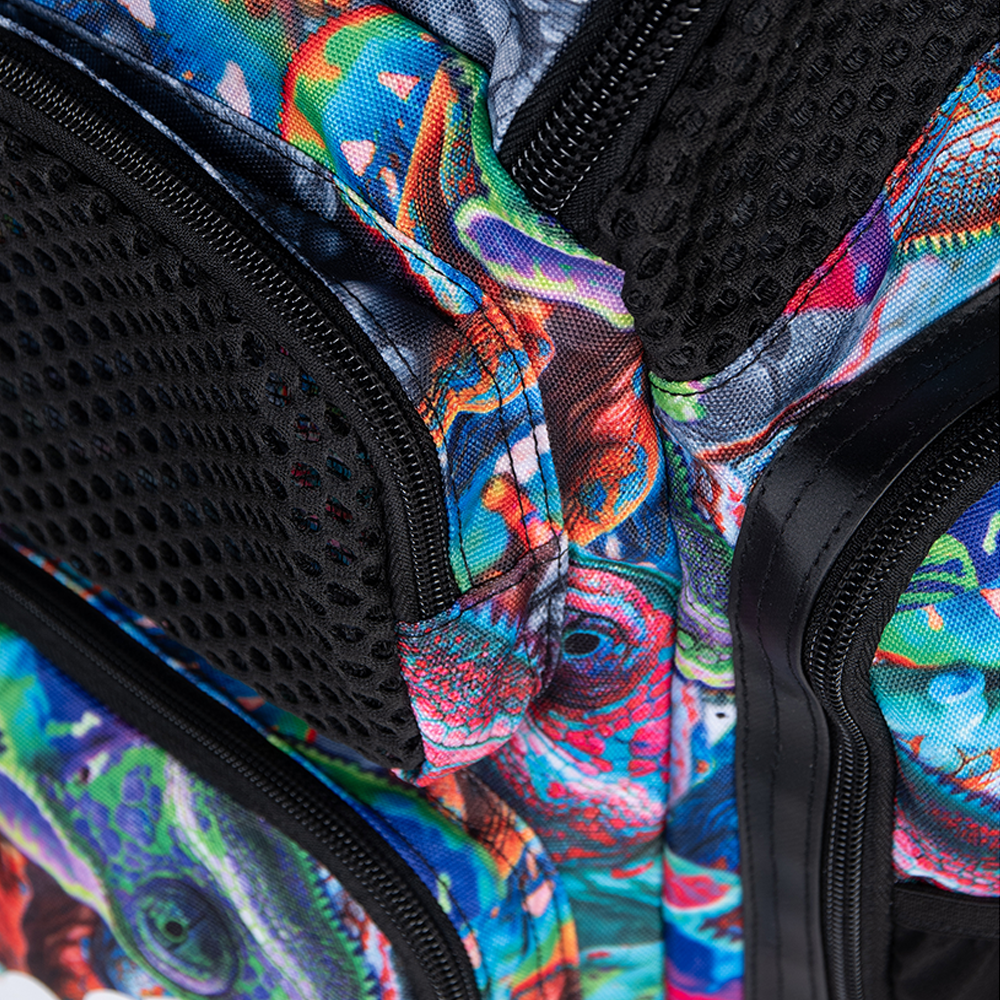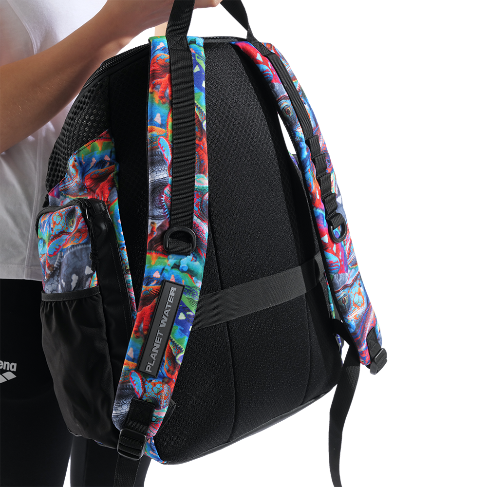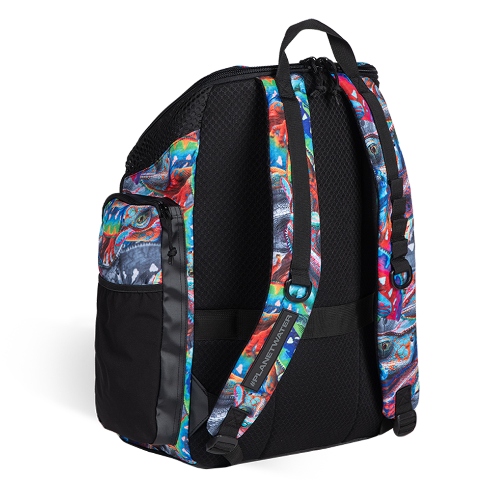 Unleash your wild side with the Iguanas One Go backpack 45. Printed with multi-coloured iguanas and finished with bold black details, this is the ultimate swim companion. Made with water-repellent fabric and moisture-control compartments, it keeps gear protected and organized. With smart features like a laptop sleeve and trolley strap, it’s equally at home on the pool deck or in the airport lounge. Perfect for swimmers who are always on the go!